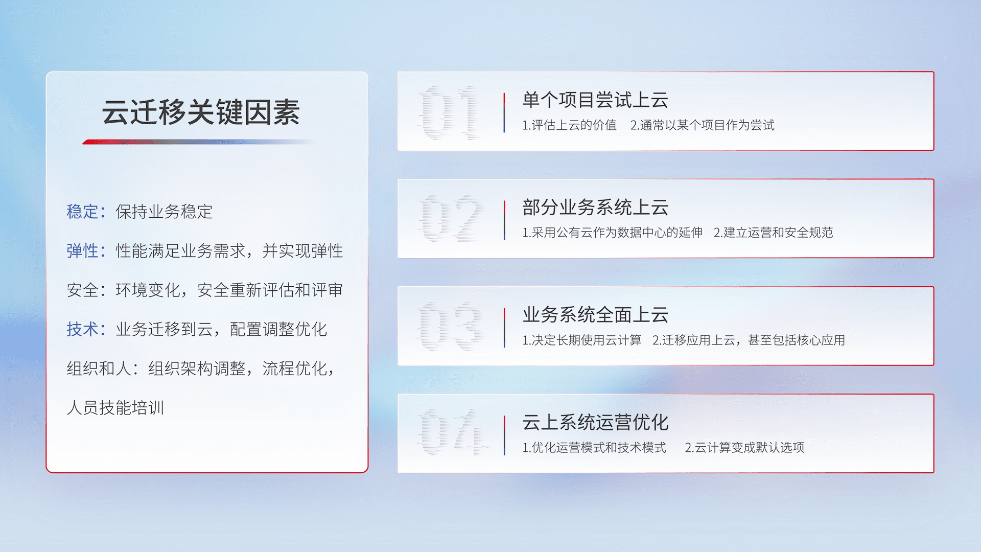 结合实际业务,,从规划设计、、、云平台选型、、云原生改造、、数据迁移、、、集成交付,,,迁移全过程为客户识别最佳上云路径,,做好风险识别管理,,,设计网络架构、、、、身份权限、、、、安全审计合规、、、、操作审计、、日志审计、、、监控告警策略、、、、多站点容灾设计等,,,对云上基础设施进行整体规划,,,,提升IT治理水平,,以满足弹性、、高可用、、、、高性能的需求。。。